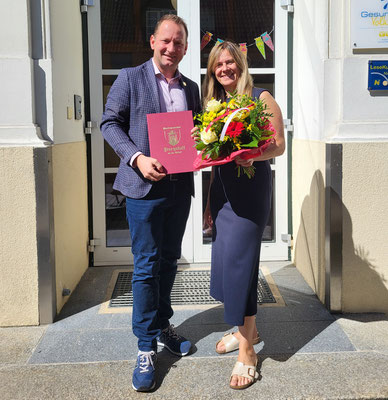 Auch Bürgermeister Harald Riemer und Caroline Seyrlehner mit ihrem Stellvertreter Thorsten Kraushofer vom Elternverein gratulierten unserer ernannten Direktorin.